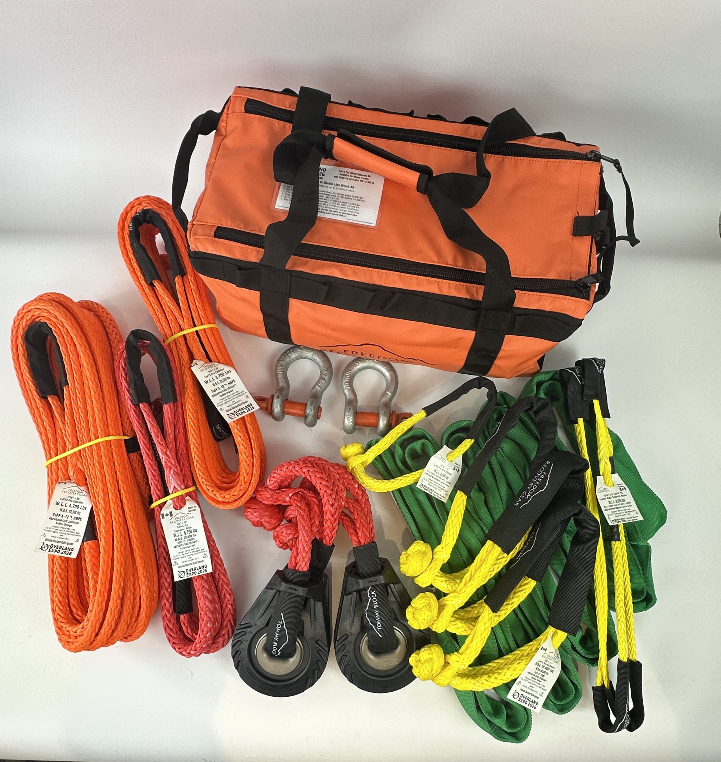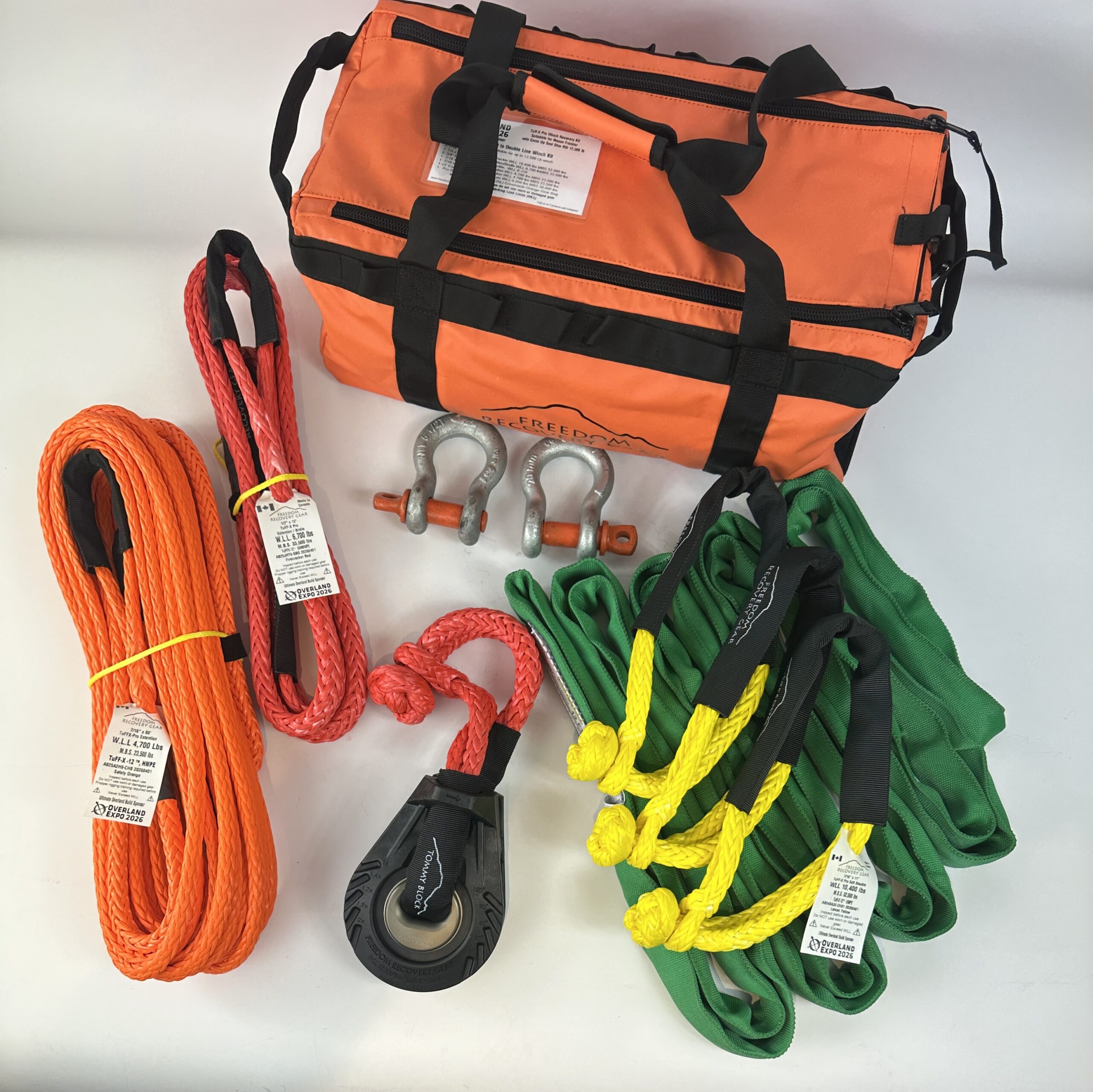 Freedom Recovery Gear is proud to release recovery kits. These kits are designed to take the guess work out of what you need, and offer additional savings over individually priced Items. They feature our Canadian Made Products such as Recovery Straps or Recovery Ropes, Made In Canada Synthetic Winch Ropes and extenders, and our Canadian Premium Soft Shackles..